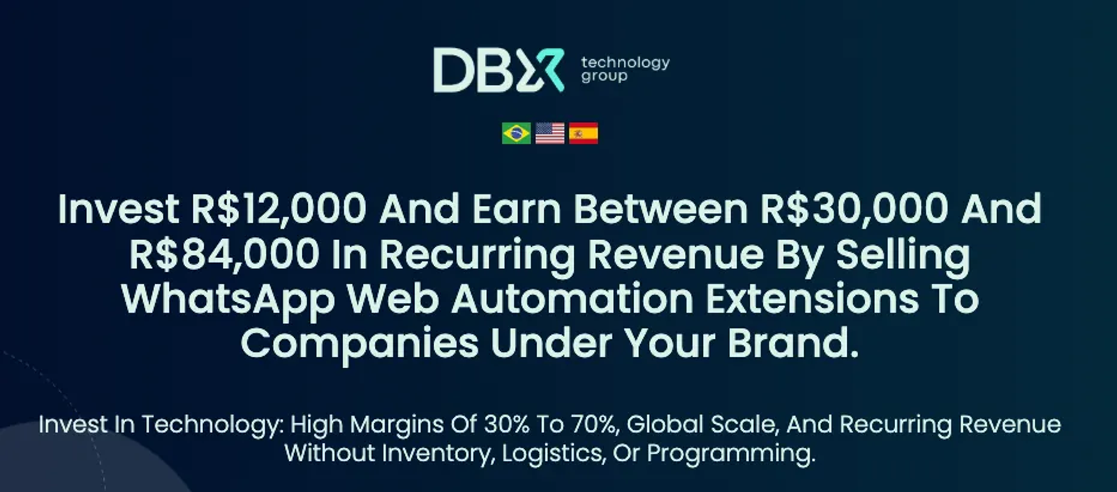 DBX Tecnologia reseller white-label program: invest R$12,000 (~USD $2,180) to rebrand and sell its WhatsApp Web extension under your own name, with promised 30 to 70 percent margins and R$30,000 to R$84,000 (~USD $5,450 to ~USD $15,270) in recurring revenue, illustrating the “franchise model” behind the 131 clone flood.