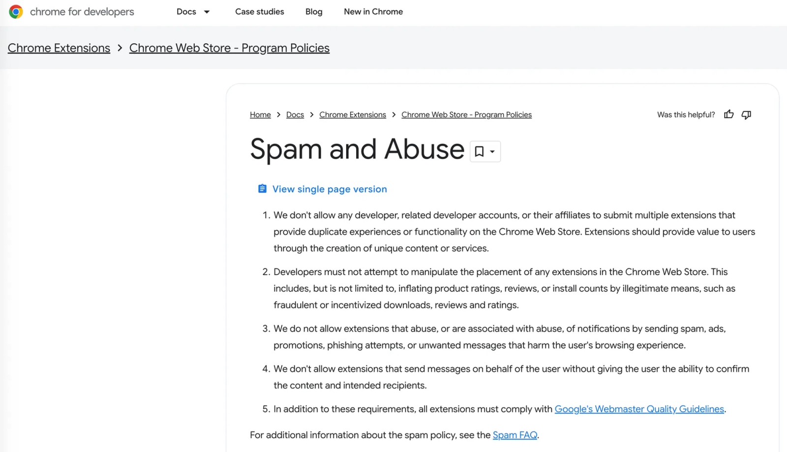Chrome Web Store Spam and Abuse policy, which the clone cluster violates by publishing duplicate experiences and by enabling spam and automated messaging on a user’s behalf.
