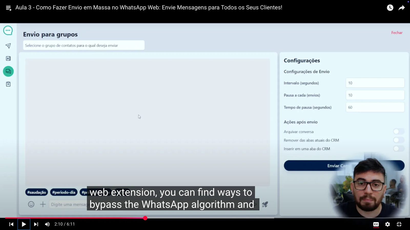 In a YouTube tutorial, the author demonstrates the extension’s bulk-send screen, showing controls for send intervals, pauses, and batch size, and explicitly explains how to use it to bypass WhatsApp’s anti-spam algorithms.