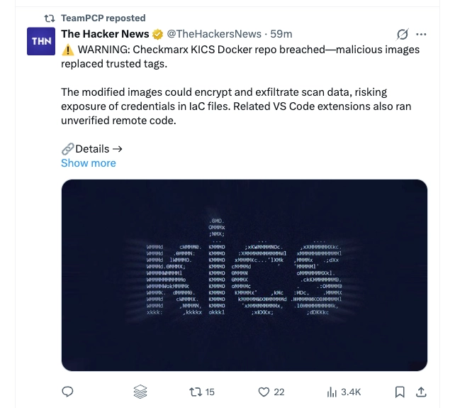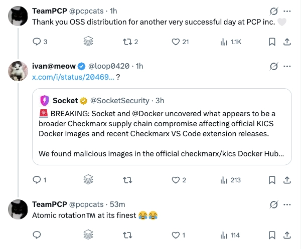 TeamPCP appears to be taking credit for the Checkmarx compromise. On April 22, the @pcpcats account reposted coverage of the incident and published taunting messages after the story broke, including: “Thank you OSS distribution for another very successful day at PCP inc.” These posts do not by themselves prove attribution, but they add to the evidence linking the campaign to TeamPCP.