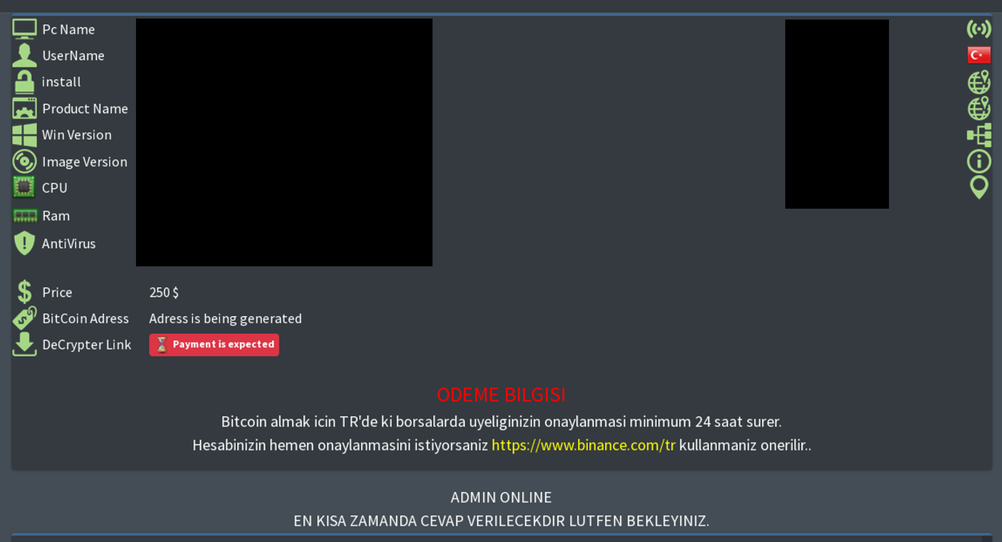 Figure 10: The victim dashboard from an unidentified Turkish-language encrypter malware or ransomware (Source: Recorded Future)