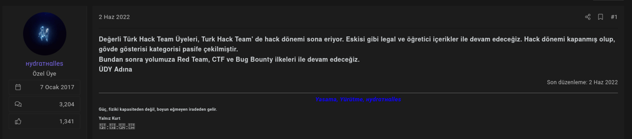 On June 2, 2022, “Hydrathalles”, a member of Turk Hack Team Forum, announced that Anka Red Team would not be engaging in any further “hacking” activities, including defacements, and that the Show of Force section of the forum would no longer be active. The user stated that Turk Hack Team Forum would continue to share “legal and educational” content. On October 15, 2022, “Bermuda”, an administrator of the forum, created a new thread where they proclaimed that Anka Red Team would recommence its hacking activities due to “the current situation”. While the threat actor did not specify what the current situation is, this phrase might refer to Turkey’s involvement in multiple geopolitical conflicts including the Russo-Ukrainian War and Turkey’s increased tensions with Greece. The threat actor explained that while it appeared that Anka Red Team was not active, they were working in the background to overcome “legal issues”, and that after installing stricter rules for the Show of Force section, the team could safely continue their operations. In the same thread, Bermuda emphasized the need for more sophisticated attack vectors including obtaining and leaking source codes and databases from victim websites, DDoS attacks, infecting devices with malware, and adding infected devices to the “THT Botnet Network”. The new rules for the Show of Force section state that team members who are able to maintain persistence via backdoors on infected devices will be added to a “special operations team”. Defacing or otherwise harming Turkish websites and carding activity is expressly prohibited by the administrators.