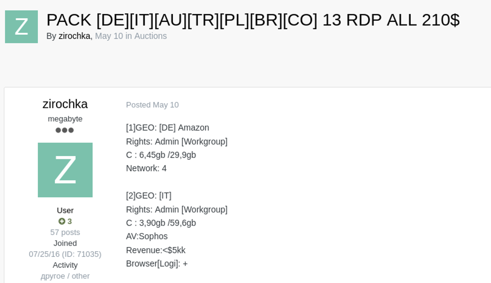 | "zirochka" | On May 13, 2022, zirochka was auctioning RDP access to 13 entities for $210, one of which is a Turkish organization with Amazon Athena Workgroup access to approximately 450 GB of data and 2 devices on its local network. The credibility of zirochka is high. |