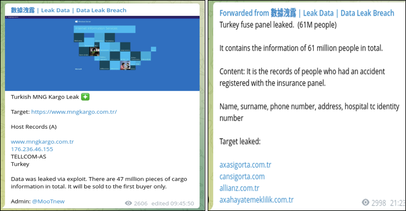 Figure 7: Compromised data from Turkish companies being advertised on the Telegram channel “data_leak_breach” (Source: 數據洩露 | Leak Data | Data Leak Breach)