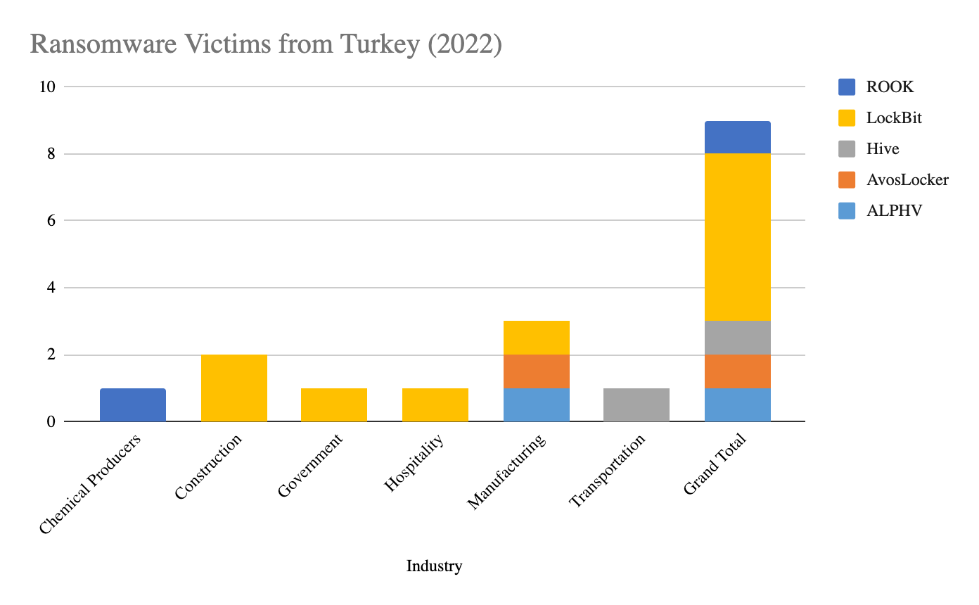 According to open-source intelligence and Recorded Future’s ransomware victim data, Turkey is a prominent target for ransomware attacks. Sophos’s report, The State of Ransomware 2022, notes that approximately 60% of the survey respondents in Turkey were targeted by ransomware in the past year and that the average cost of rectifying the attack was $370,000 USD. According to CheckPoint, in 2020 Turkey was the 5th-most targeted country in ransomware attacks, behind Russia, Sri Lanka, India, and the US.