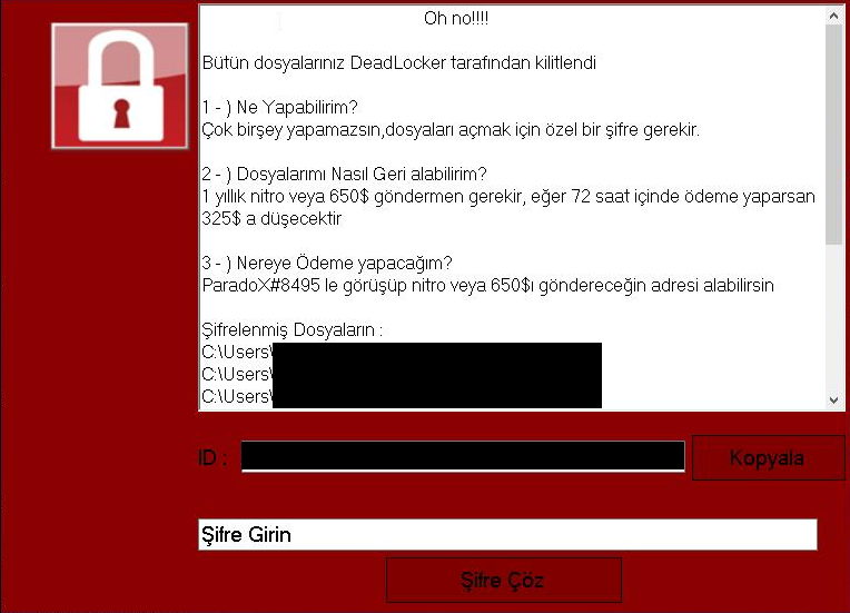 Figure 9: A ransom note written in Turkish from “DeadLocker” ransomware (Source: MalwareHunterTeam)