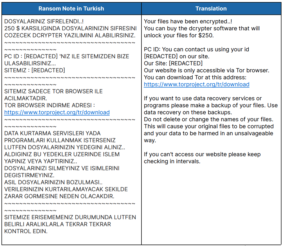 Table 1: Turkish ransom note left on victim’s device after it was infected by an unidentified encrypter malware (Source: Recorded Future)