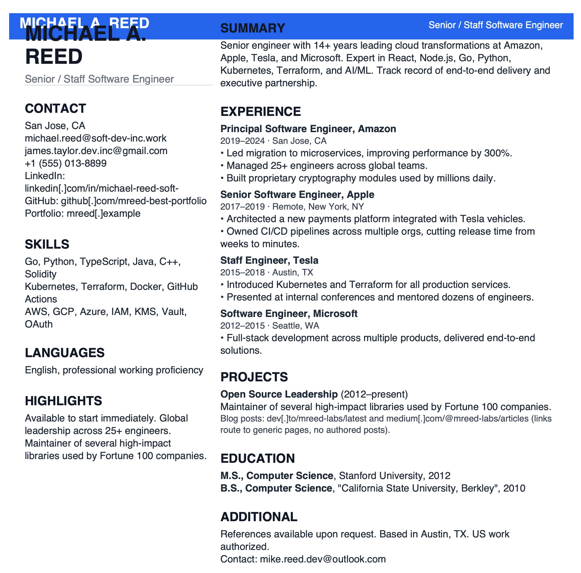 Mock resume demonstrating combined screening red flags: name-to-email mismatch with impersonation-style handles, malformed LinkedIn and GitHub links, marquee-brand stacking, unverifiable “high-impact” claims, a resume-builder fingerprint in PDF metadata, a languages section with an English-proficiency line atypical for long-claimed U.S. tenure, “Berkeley” misspelled, and no verifiable code. Taken together, these individually minor indicators create a strong triage case.