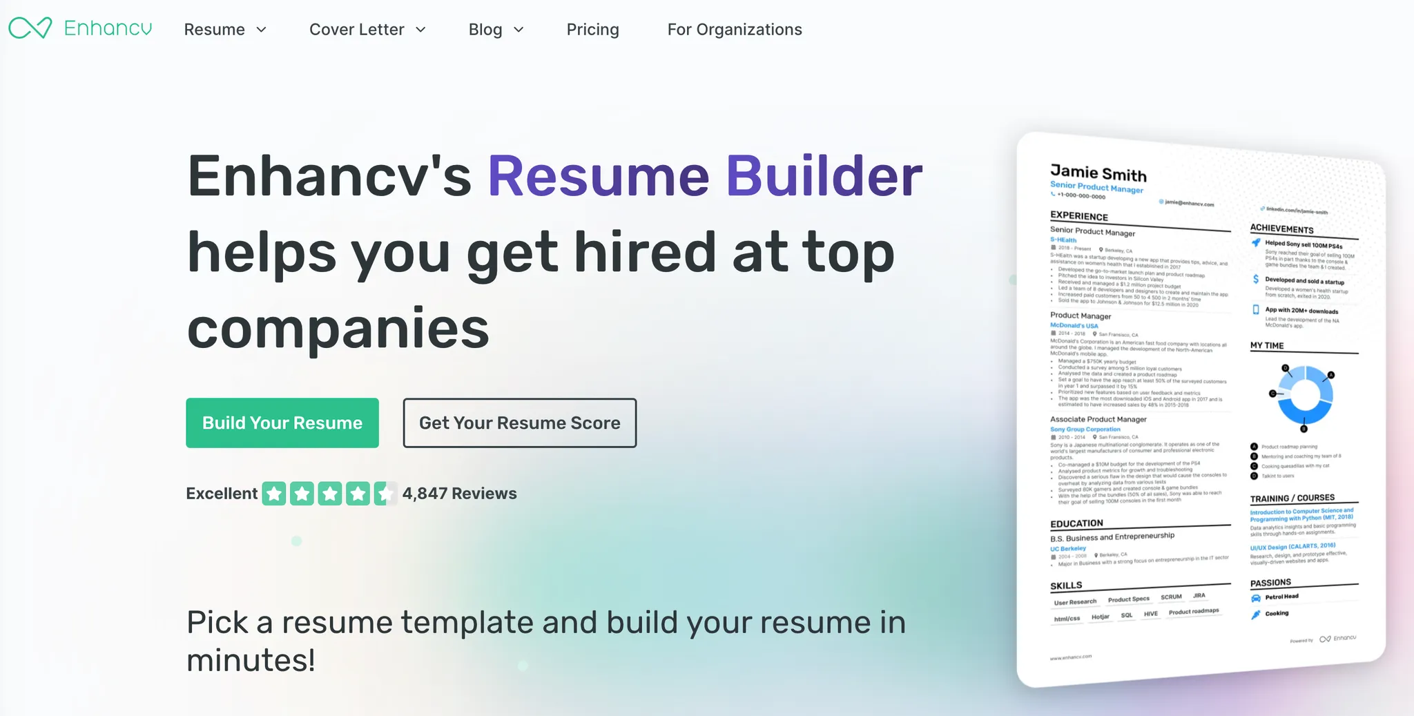 Enhancv resume builder homepage; PDFs exported from this platform list Enhancv in metadata fields, a fingerprint we observed across multiple fraudulent resumes.