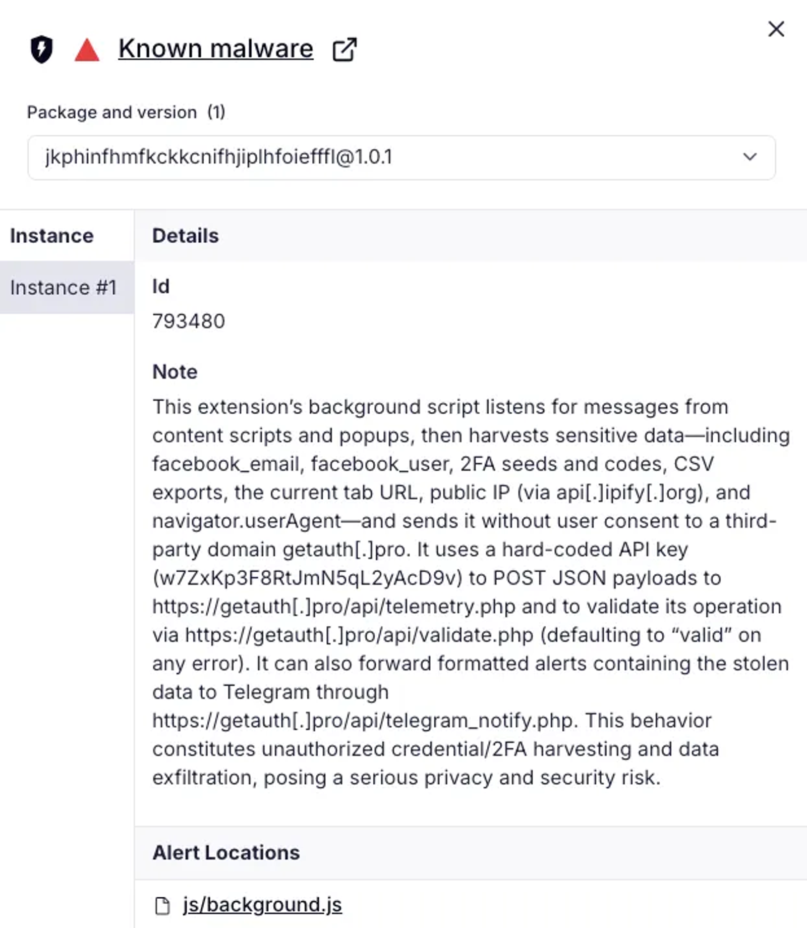 Socket AI Scanner’s analysis of the malicious CL Suite by @CLMasters Chrome extension highlights that its background script collects Facebook account identifiers, 2FA seeds and codes, CSV exports, tab URL, public IP, and user agent, then exfiltrates this data with a hardcoded API key to getauth[.]pro telemetry and validation endpoints and forwards formatted dumps to a Telegram notification API, confirming deliberate credential and 2FA harvesting.