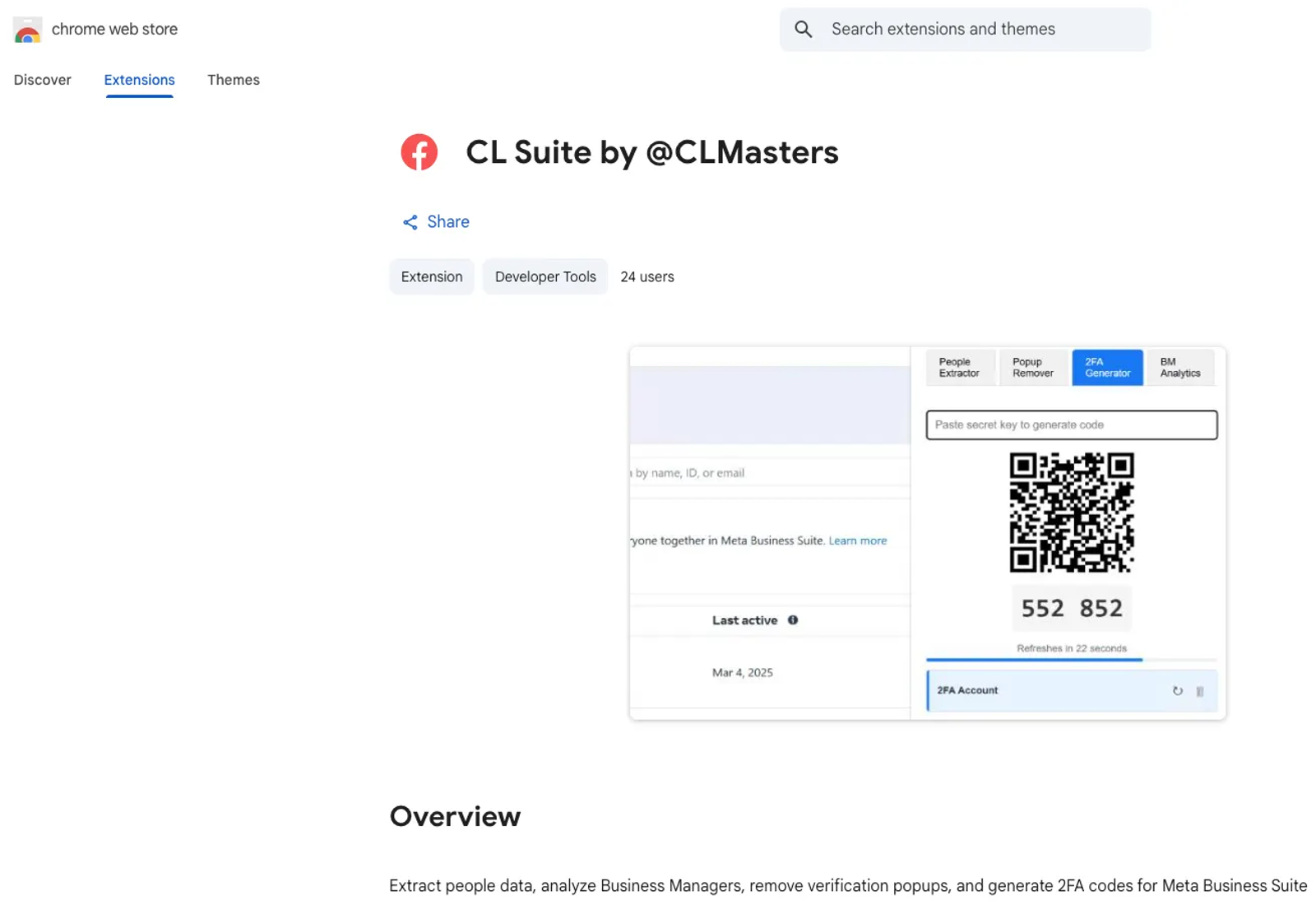 Chrome Web Store listing for the CL Suite by @CLMasters extension openly advertises the ability to “extract people data, analyze Business Managers, remove verification popups, and generate 2FA codes” for Meta accounts, while the underlying code also harvests TOTP seeds, 2FA codes, and Business Manager contact and analytics data and exfiltrates it to threat actor-controlled infrastructure.