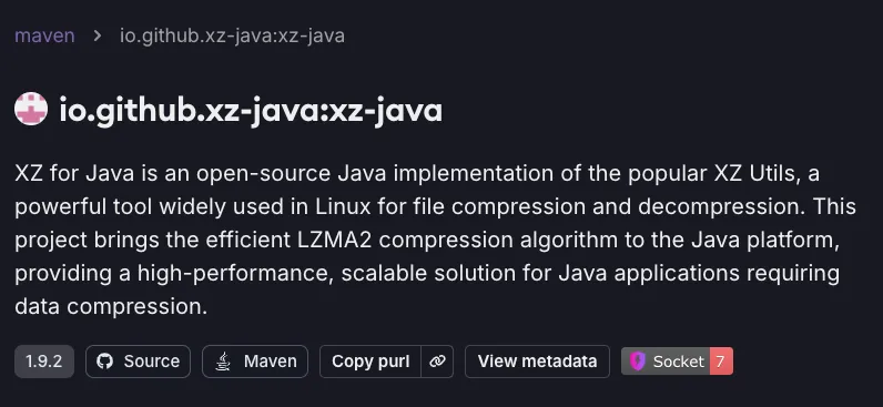 Socket identifies the io.github.xz-java:xz-java package as malicious because it analyzes every file in the package, including the compiled binary JAR (xz-java-1.9.2.jar), the source code JAR (xz-java-1.9.2-sources.jar), and any accompanying metadata.