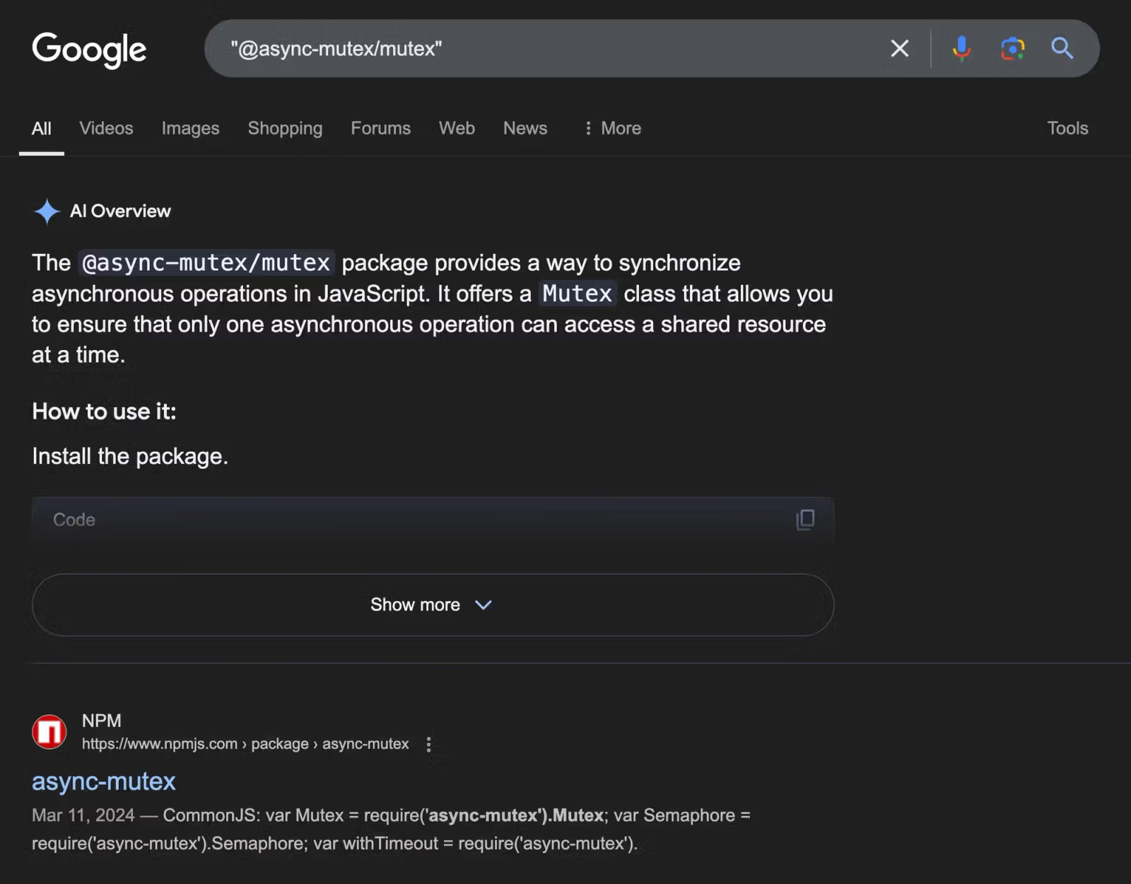 This screenshot shows Google’s AI-generated search results at the time we discovered the malicious @async-mutex/mutex package.