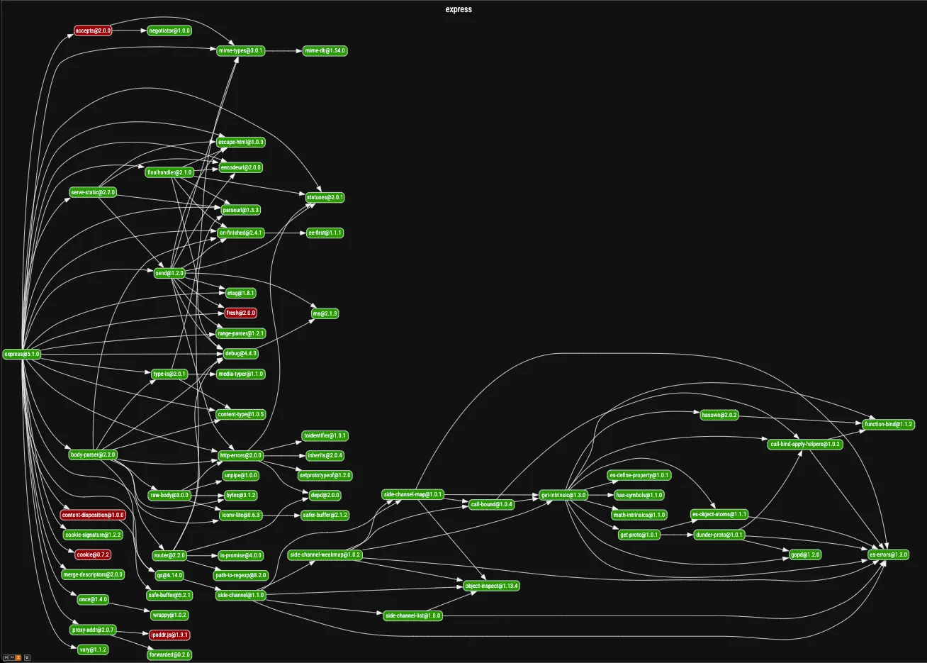 This image shows a live dependency graph for the popular express package, generated using npmgraph.js.org. Each node represents a direct or transitive dependency. The graph highlights the complexity of modern package ecosystems, where a single package like express pulls in dozens of nested dependencies — each introducing its own security and maintenance risks.