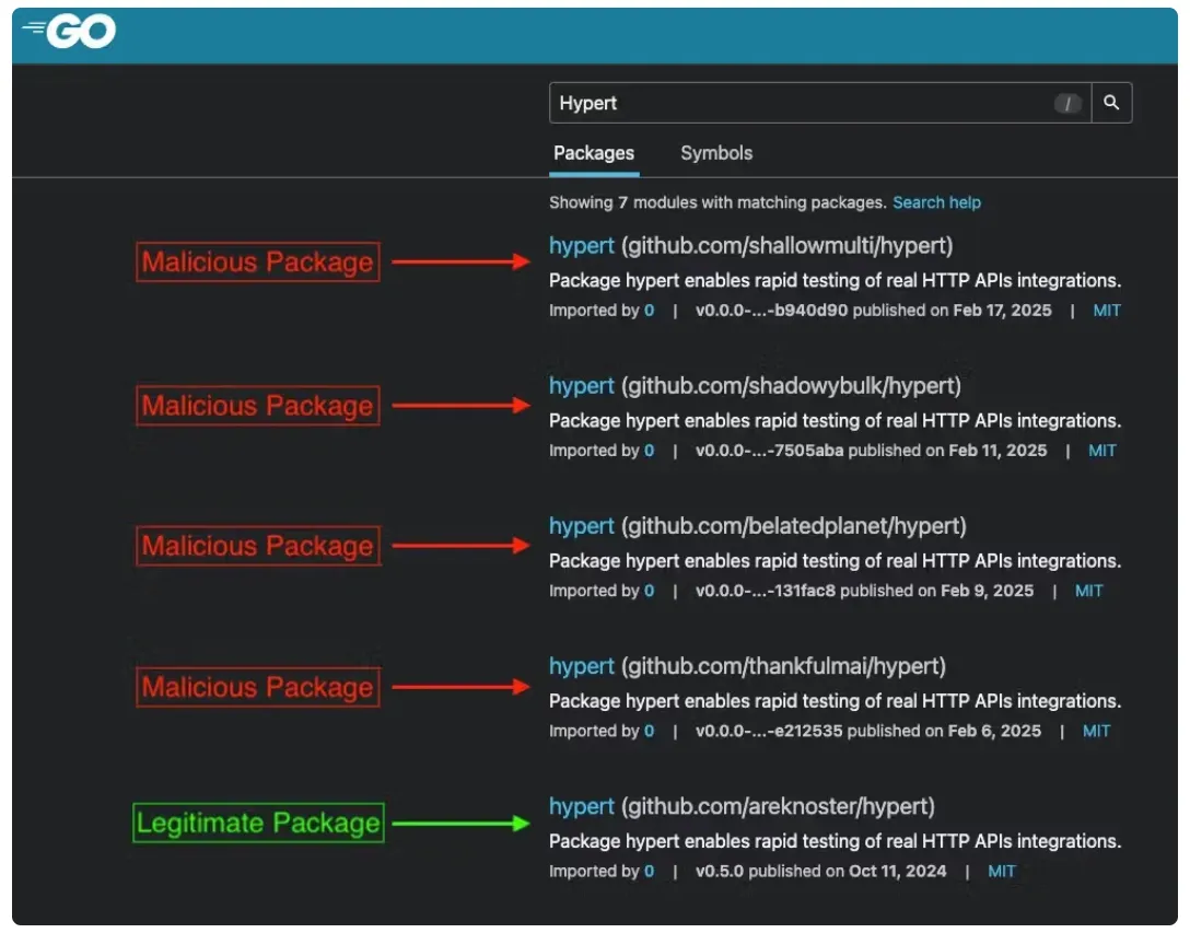 This screenshot from the Go ecosystem highlights a real-world typosquatting campaign. Multiple malicious packages — each impersonating the legitimate hypert module — appear nearly identical in name and description. Go (pun intended) figure which one is the right one. “You’ve gotta ask yourself a question: Do I feel lucky?” Identifying the real package in a list like this isn’t as easy as it looks.