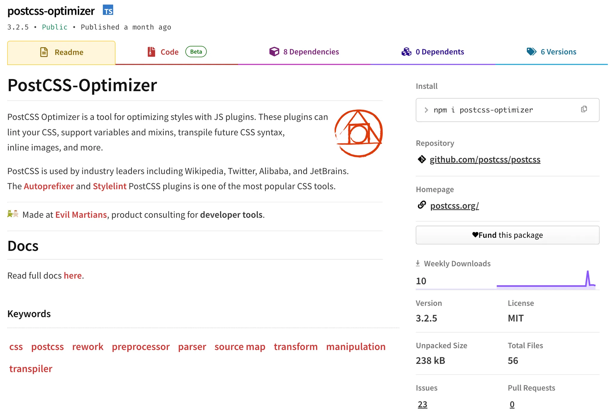 A screenshot of the malicious postcss-optimizer package on the npm registry.