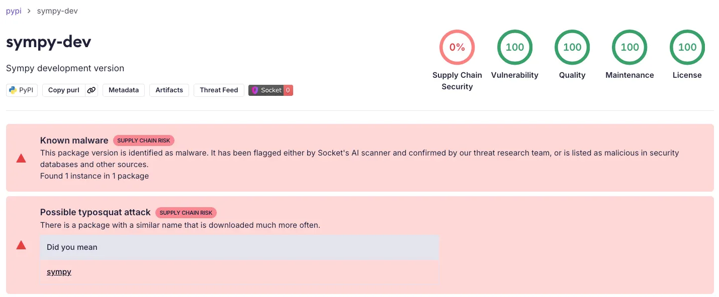 Socket’s analysis of the malicious sympy-dev PyPI package flags it as malware and a likely typosquat of the legitimate sympy library.