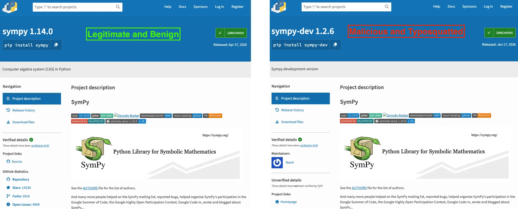 Side-by-side PyPI listings contrast the legitimate sympy package (left) with sympy-dev (right), a malicious typosquat that reuses SymPy’s project description and suggests pip install sympy-dev, increasing the risk of accidental installation.