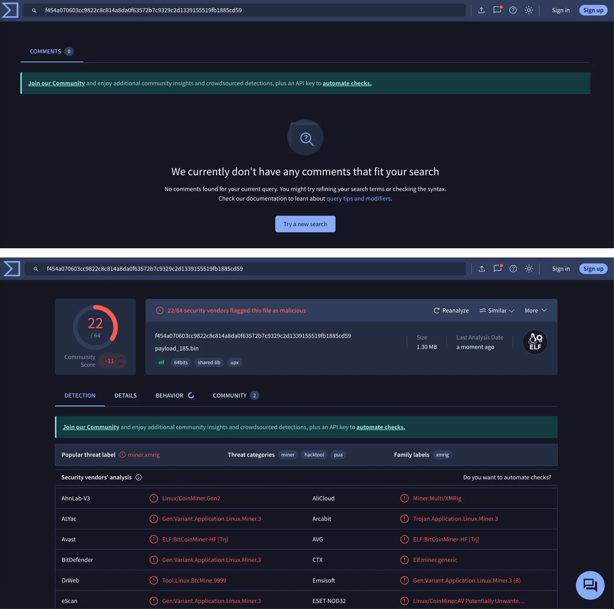 For both recovered payload hashes, VirusTotal showed no community comments or prior context before our submission (top). After submission, VirusTotal reanalysis flagged the payloads as malicious (bottom); the hash shown here (SHA-256: f454a070603cc9822c8c814a8da0f63572b7c9329c2d1339155519fb1885cd59) was detected by 22 of 64 engines as an XMRig-linked coinminer and identified as a UPX-packed Linux ELF.