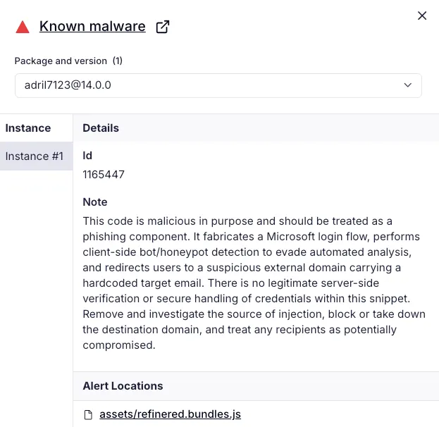 Socket AI Scanner’s analysis of the malicious adril7123 package flags assets/refinered.bundles.js as a phishing component that fabricates a Microsoft login flow, uses client-side bot and honeypot checks to evade automated analysis, and redirects users to threat actor-controlled infrastructure while carrying a hardcoded target email.
