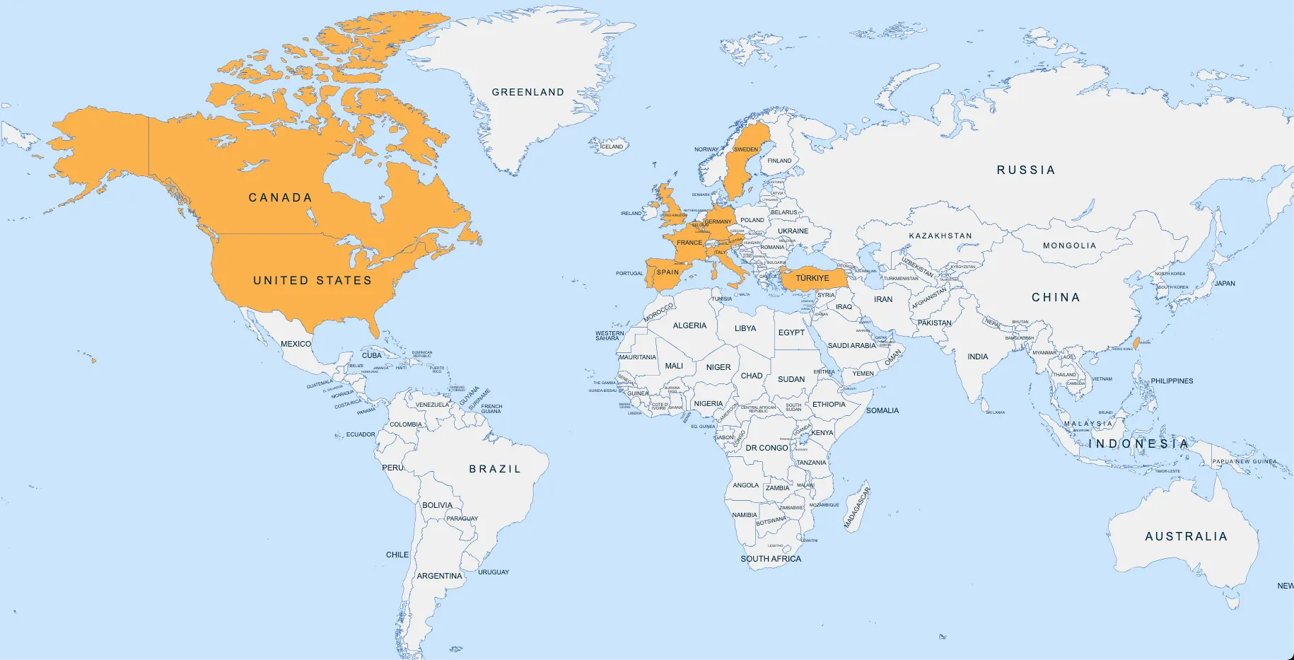 Map visualization highlighting the countries targeted in this npm-hosted spearphishing operation: Austria, Belgium, Canada, France, Germany, Italy, Portugal, Spain, Sweden, Taiwan, Turkey, the United Kingdom, and the United States, spanning North America, Europe, and East Asia region. Most of the highlighted countries are U.S. allies or close partners.