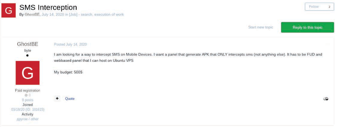 Another type of fraud against mobile carriers is SMS interception attack, which is a different attack vector based on targeting the global telephony protocol Signaling System 7. Some threat actors perform or actively look for SMS interception services; however, SMS interception requires technical proficiency from a hacker and is usually performed by threat actors who operate botnets, web injects, or other malware to compromise high-value targets.