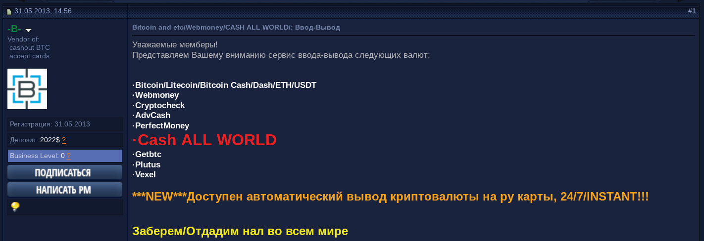 For example, money laundering services operated by the threat actor “-B-“ offer features such as the transfer of Bitcoin into virtual currencies popular in the Commonwealth of Independent States (CIS) such as PerfectMoney and WebMoney. For Russian citizens, money can be directly deposited into “payment cards” (likely referring to prepaid cards). -B- further claims they can deposit or send physical cash to locations throughout the world. -B- continues to operate as an active member of Verified Forum.