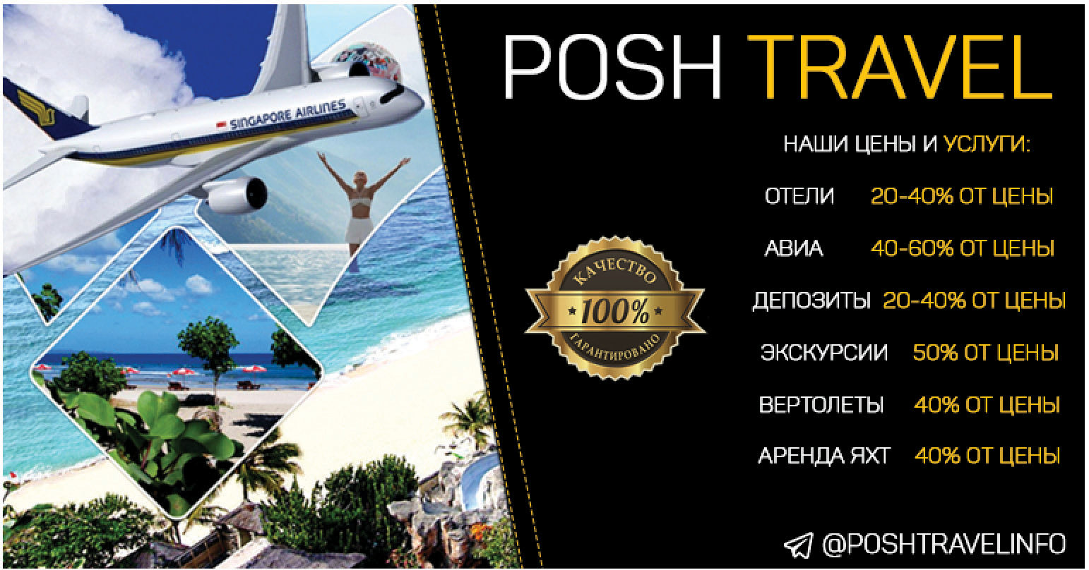 [Translation: POSH TRAVEL — OUR PRICES AND SERVICES: HOTELS 20-40% OF ACTUAL PRICE, AIR 40-60% OF ACTUAL PRICE, DEPOSITS 20-40% OF ACTUAL PRICE, TOURS 50% OF ACTUAL PRICE, HELICOPTERS 40% OF ACTUAL PRICE, YACHT RENTAL 40% OF ACTUAL PRICE, @POSHTRAVELINFO]