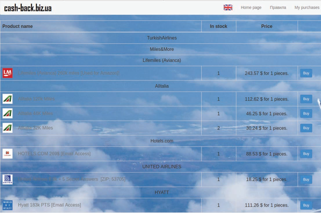 Figure 14: cash-back[.]biz.ua shop selling multiple compromised airline and hotel accounts (Source: cash-back[.]biz.ua)