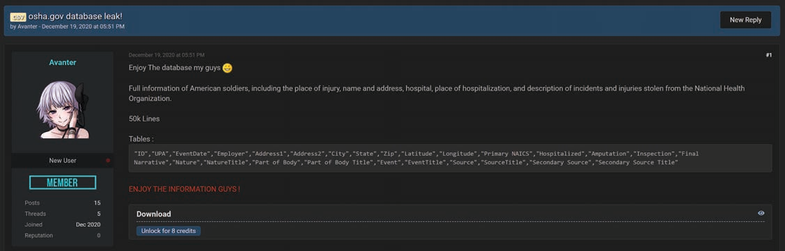 In one of the most recent events, in December 2020, “Avanter”, a member of the mid-tier Raid Forums, was identified sharing a US Department of Labor Occupational Safety and Health Administration (osha[.]gov) database that consisted of the full names and physical addresses, the place of hospitalization, and a description of incidents and injuries for American soldiers.