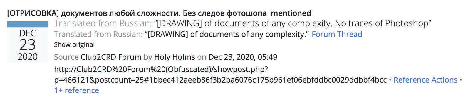 Cybercriminals use counterfeit IDs mostly for carding, as merchants sometimes require buyers to present an ID when conducting a purchase. Some banks and similar financial institutions also require electronic copies of IDs for identity verification. This is particularly true of e-banks, which rely heavily on digital documents and images as part of their KYC (“know your customer”) practices. The Russian-language slang for the production of counterfeit documents is “otrisovka” (отрисовка), whose literal translation is “drawing” or “painting”. Figure 17 below shows an example of a search result for “otrisovka” on the Recorded Future Platform, in which the threat actor “Holy Holms” is offering to produce counterfeit documents on the forum Club2CRD.