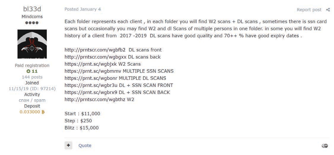 One example of the sale of such data happened on January 6, 2021, when “bl33d”, a member of the top-tier forum Exploit, was seen auctioning off US taxpayer personally identifiable information for 1,500 individuals, which included W-2 forms, driver’s licenses, and SSN scans from 2017 to 2019. bl33d provided screenshots that indicate the data was possibly obtained from a CPA in California, making it likely to be used to claim fraudulent tax returns in that state.