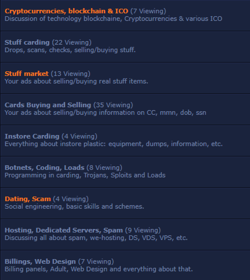 Like any complex profession, fraud is a trade that requires education and cooperation to master, or, at the very least, become proficient in. Knowledge of this trade is passed down to new fraudsters from more experienced operators in criminal underground forums, some of which have been around for a quarter of a century. Popular fraud forums such as Verified, Omerta, and WWH Club provide newcomers the tutelage, professional relationships, and resources satisfying the full spectrum of needs for any fraudster. The forum Verified, arguably one the most prolific fraud-related forums predominately catering to Russian-speaking threat actors, has an extensive list of sections pertaining to specialized types of fraud, as seen below:
