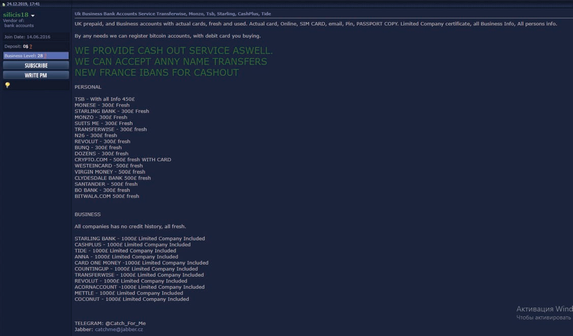 One example that can be found on Verified Forum is an advertisement posted by “silicis18”, a member of multiple underground communities, where they offer a wide variety of ready-to-go bank accounts for money laundering purposes, as seen in Figure 20 below.