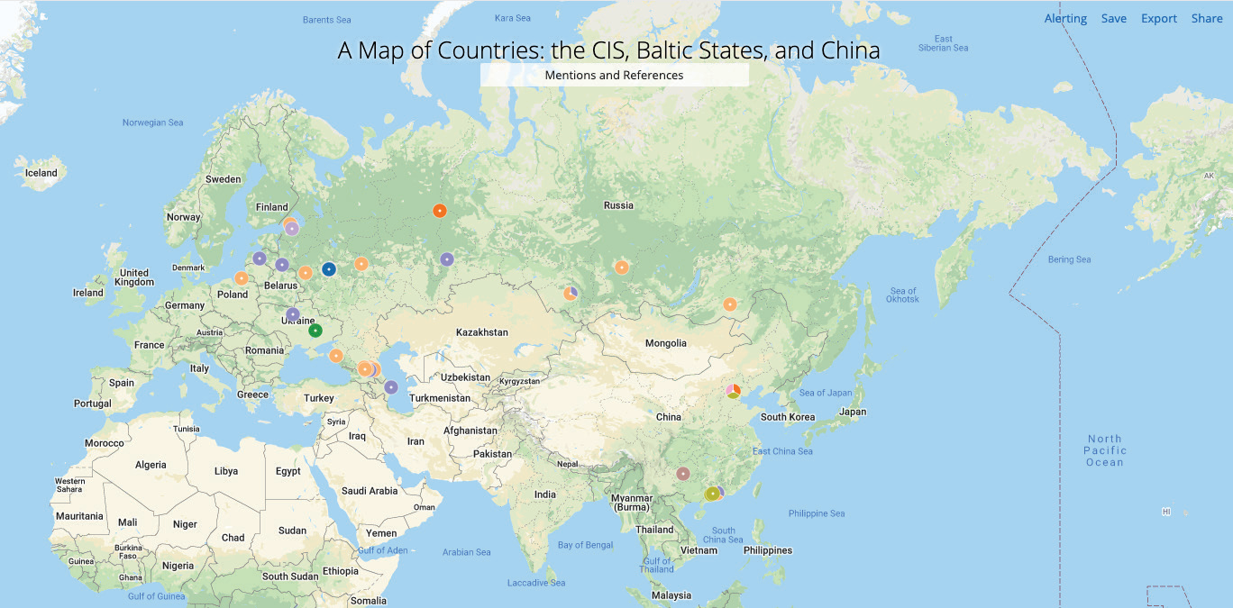 Figure 3: The CIS, Baltic States, and China, map of mentions and references (Source: Recorded Future)