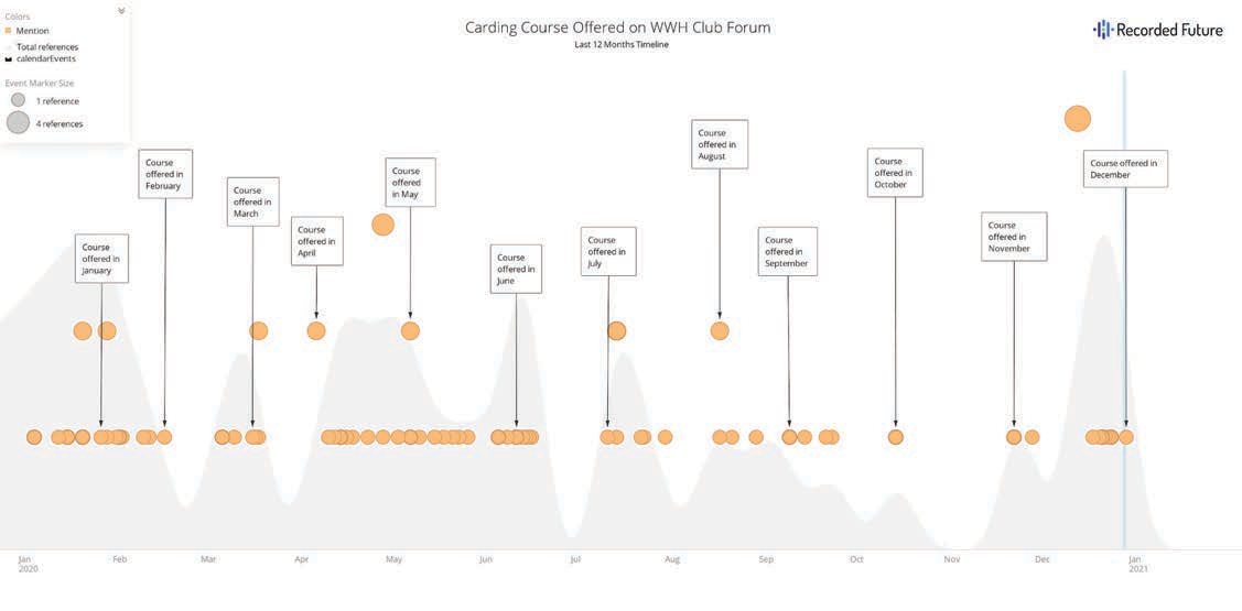 Figure 4: Timeline of the carding course offered on WWH Club, January 2020 to January 2021 (Source: Recorded Future)