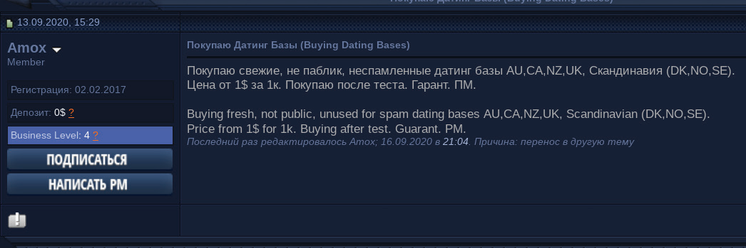 Spammers specializing in dating scams provide specified mailing lists of targets thought to be more susceptible to this type of attack — the type of individual who may be hoping for an email from the person of their dreams. These mailing lists are geographically relevant to the victims being targeted (such as the United States, Canada, and Australia), and are likely sourced from leaked or fraudulent online dating databases. One such threat actor named “Amox” was looking to purchase email accounts from private databases acquired from dating websites paying one dollar per 1,000 accounts.