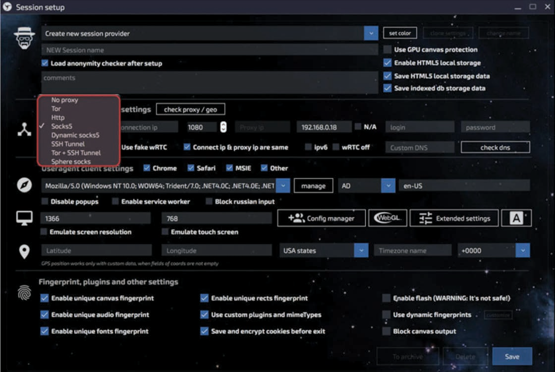 Every web browser has a unique fingerprint known to legitimate websites. E-commerce companies and banks often use this type of fingerprinting to block transactions from browsers that have previously been recognized as insecure or involved in fraudulent activity. The practice by cybercriminals of using various virtual machines, proxies, and VPN servers is not that effective since the anti-fraud systems have capabilities to identify suspicious IP addresses and virtual machines. As a result, cybercriminals have developed anti-detection software, such as Linken Sphere, AntiDetect, Multilogin, Che Browser, and FraudFox. These anti-detection software services allow threat actors to change all web browser configurations dynamically and generate an unlimited number of new ones, imitating the activities of legitimate users.