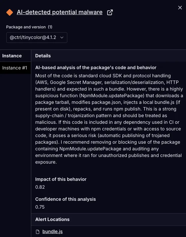 The issue was first noticed by Daniel dos Santos Pereira, who flagged suspicious behavior in the latest release. Socket’s automated malware detection also surfaced the threat in 40+ additional packages, and our research team continues to analyze the payload and its distribution method. While tinycolor is the most visible package, with 2.2 million weekly downloads on npm, it did not originate these compromises, but is one package among dozens trojanized in this active campaign.
