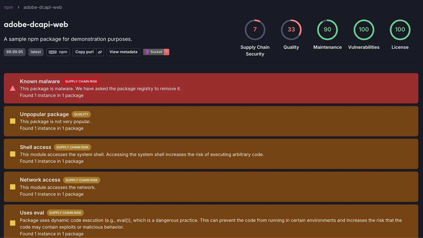Socket’s AI scanner flagged adobe-dcapi-web package as malicious.